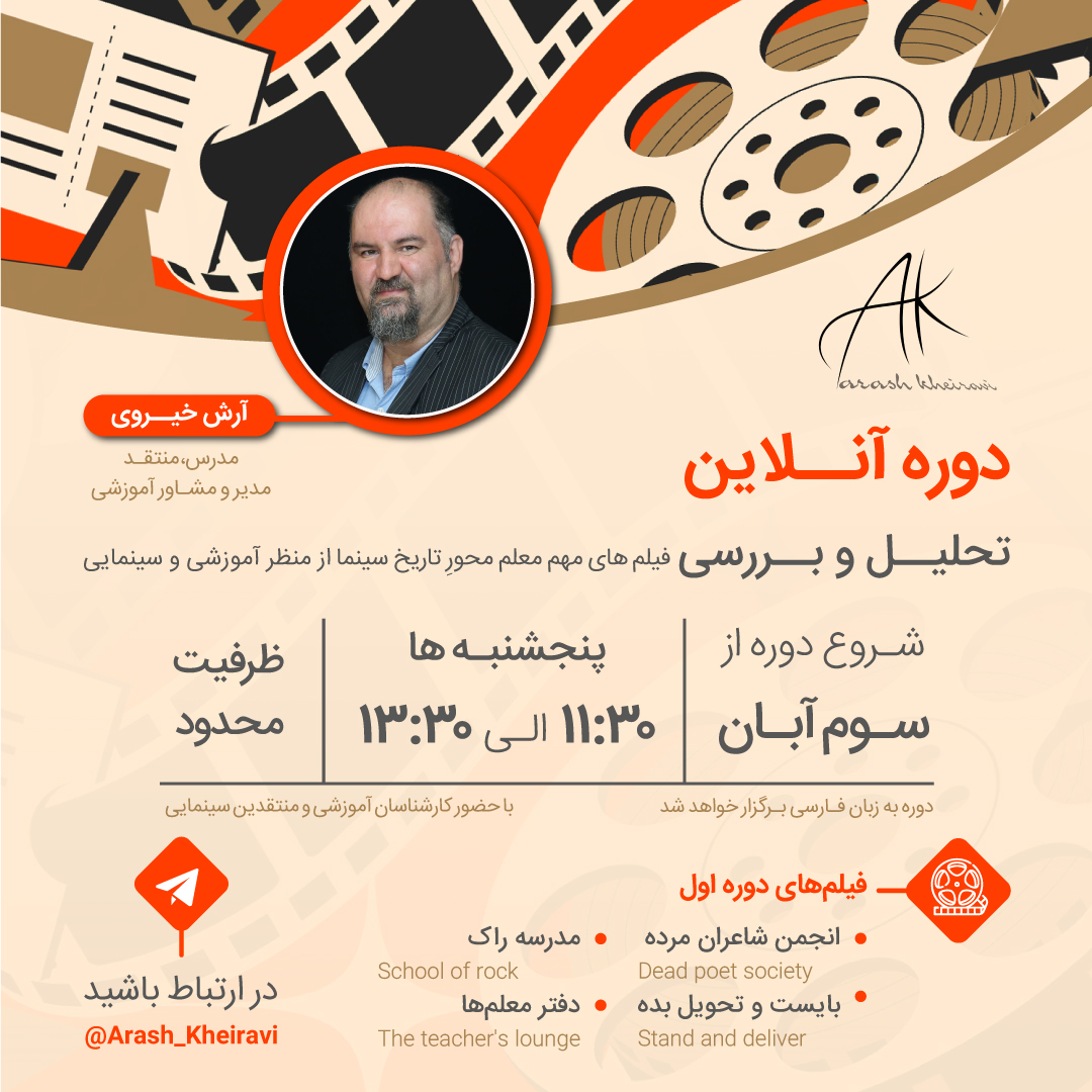 به دلیل آشنایی داشتن و فعالیت در هر دو حوزه آموزش، تصمیم گرفتن این دوره جذاب را برای علاقه مندان همزمان به آموزش و سینما طراحی کنم. فیلم های مهمی در سینما وجود دارند که فارغ از کیفیت ساختاری آن ها و پیامهای مهمی که منتقل می کنند، برای معلم ها و کارشناسان و علاقه مندان به حوزه آموزش، حاوی نکاتی سودمند و قابل تامل هستند که با صحبت درباره آنها در کنار متخصصین آموزش و منتقدان سینما، می توان با لذت یافت و برای ساختن دیدگاهی نو و کارآمد به کار برد. در هر دوره آنلاین از فیلمهای مهمِ معلم محور تاریخ سینما، چهار فیلم در 90 دقیقه مورد بررسی قرار می گیرد و از زوایای مختلف درباره آن ها صحبت می شود. این دوره به زبان فارسی برگزار می شود تا مخاطبان بیشتری از گروه های مختلف بتوانند در آن حضور پیدا کنند.